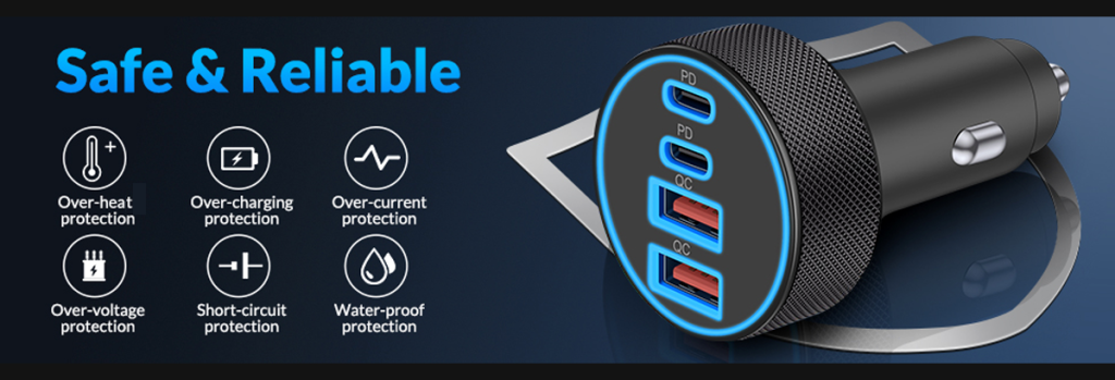 Keep your devices and your passenger’s devices fully charged at all times. This fast-charging 90w charger includes 2 USB 2.0 and 2 USB-C outlets. Also protects against over-charging and over-heating.