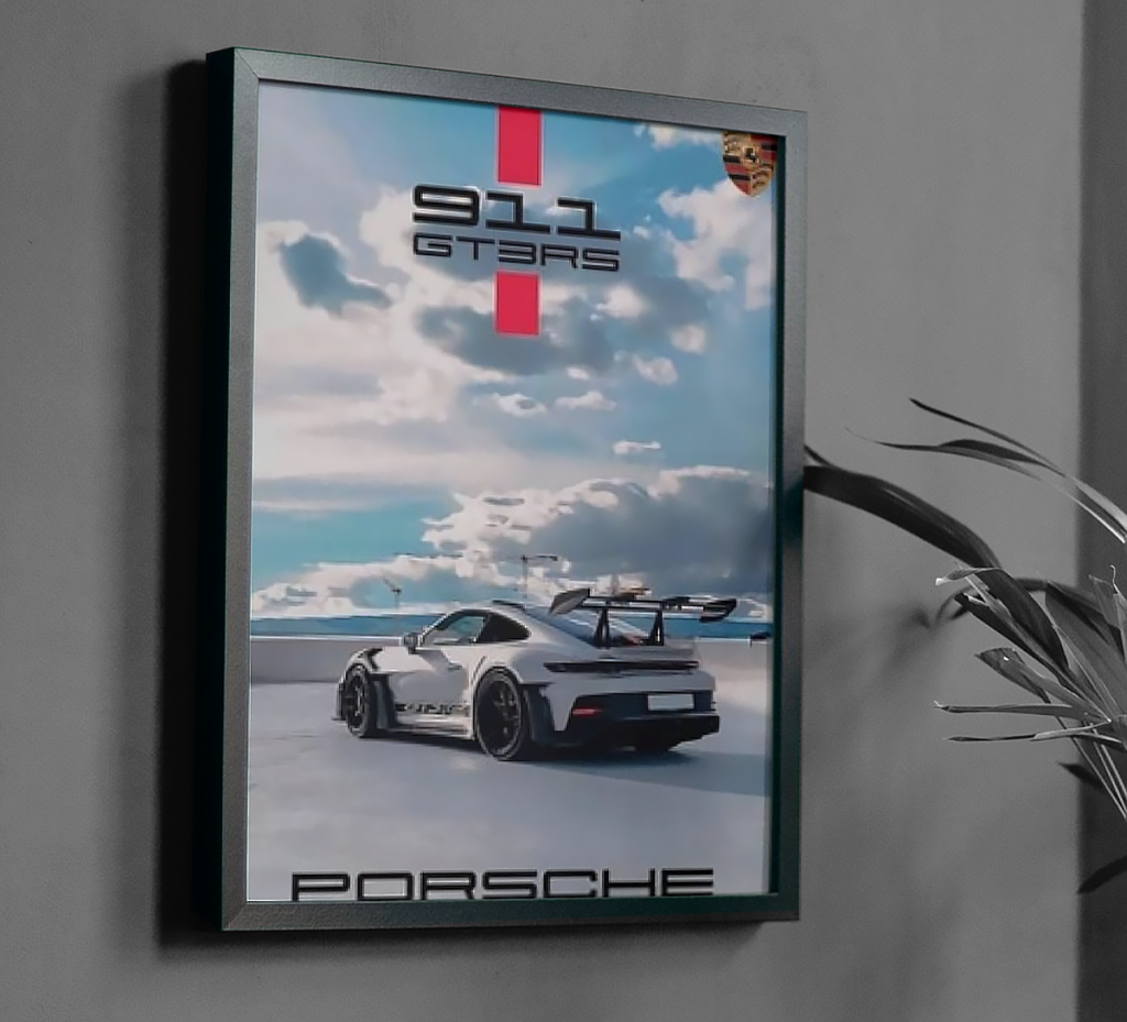 Bring motorsport energy to your walls with this high-impact print featuring the Porsche 911 GT3 RS under a dramatic sky. The combination of bold typography, a signature red racing stripe, and the iconic Porsche badge gives this piece a track-ready yet modern aesthetic—perfect for garages, offices, or living spaces.