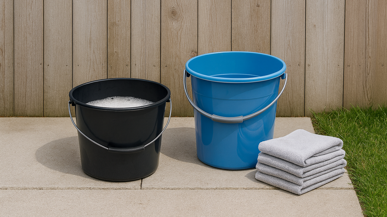 - Fill one bucket with lukewarm water and the other with cold water for rinsing.