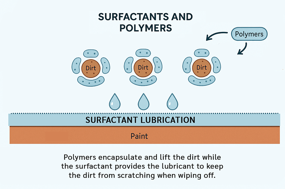 This chemistry is why rinseless washes can be done safely without blasting the surface with water.